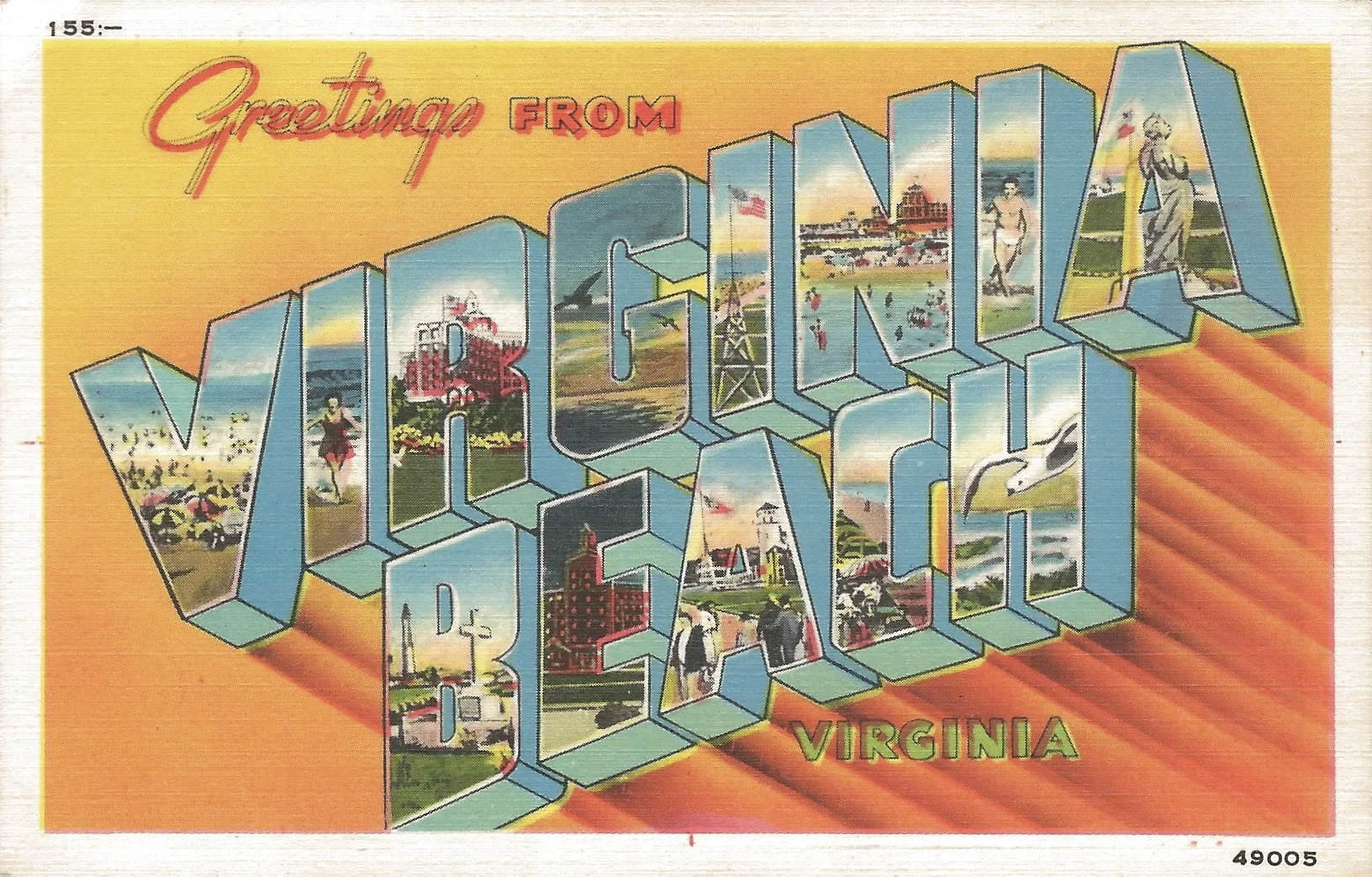 Did I ever mention I collect vintage postcards of Virginia Beach? Well, I do. And this seems like the perfect occasion to break out a few. These date from the late-1930s to the 1940s, when oceanfront hotels were graceful two- and three-story inns with wraparound porches. Without air conditioning.