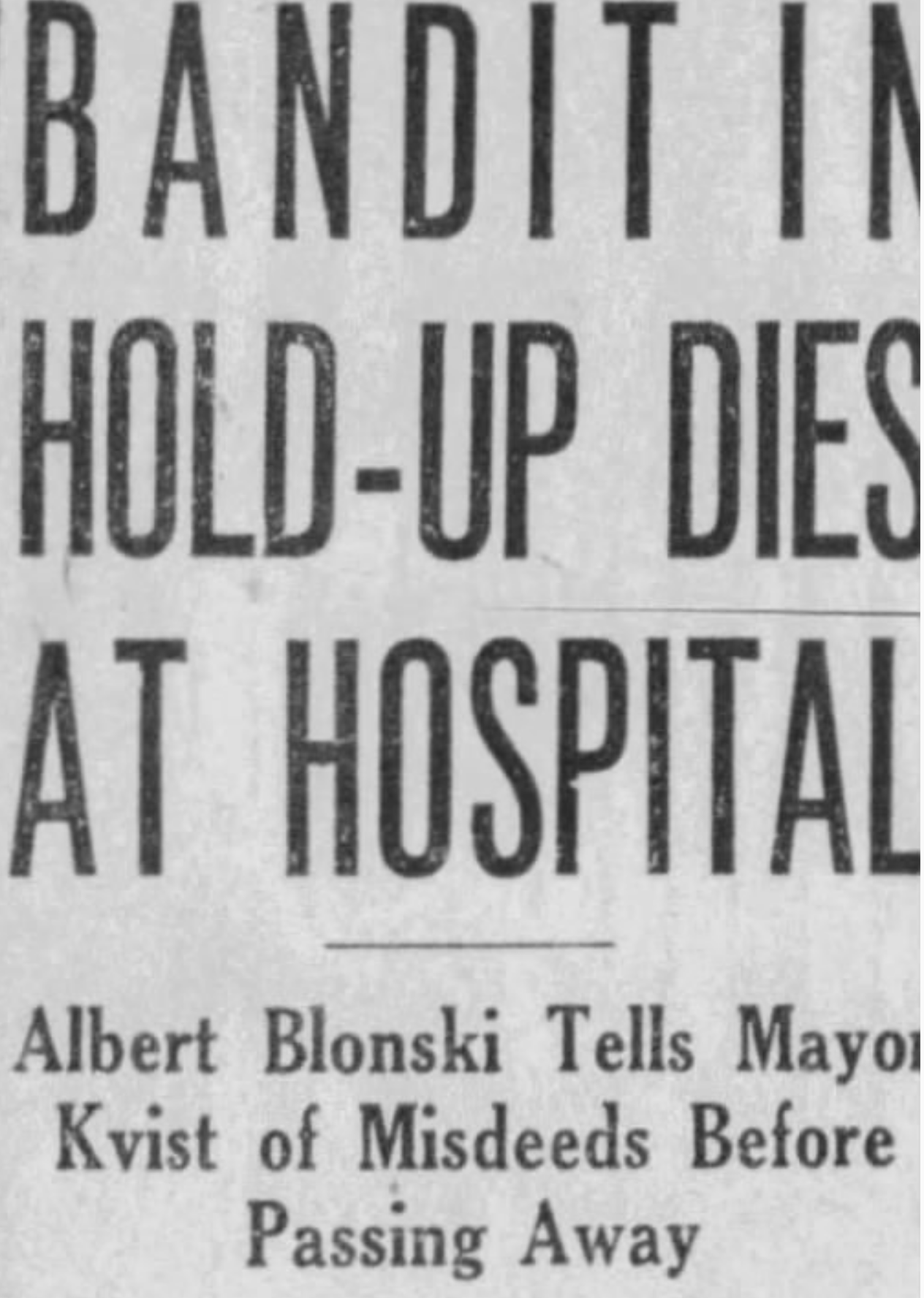 “Bandit In Hold-Up Dies At Hospital: Albert Blonski Tells Mayor Kvist of Misdeed Before Passing Away.”