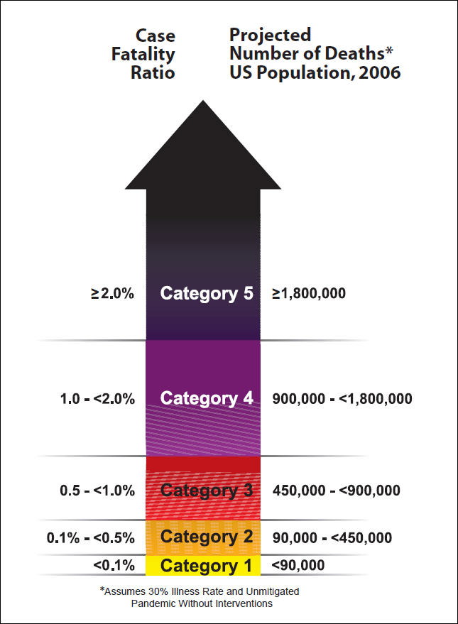 Current projections are in Category 2. If you look at the charts below, you will see that at federal urging state governments are implementing Category 4 and 5 recommendations to keep the pandemic outcomes at Category 2 levels.