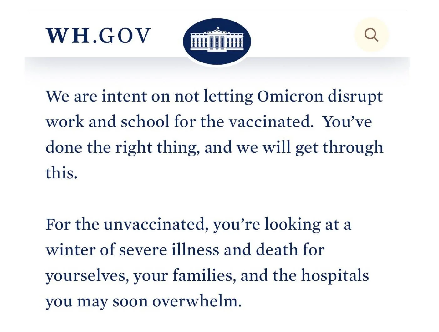 To sum up the presidential address: If you aren’t vaccinated, you’re going to get sick and die. Merry Christmas.