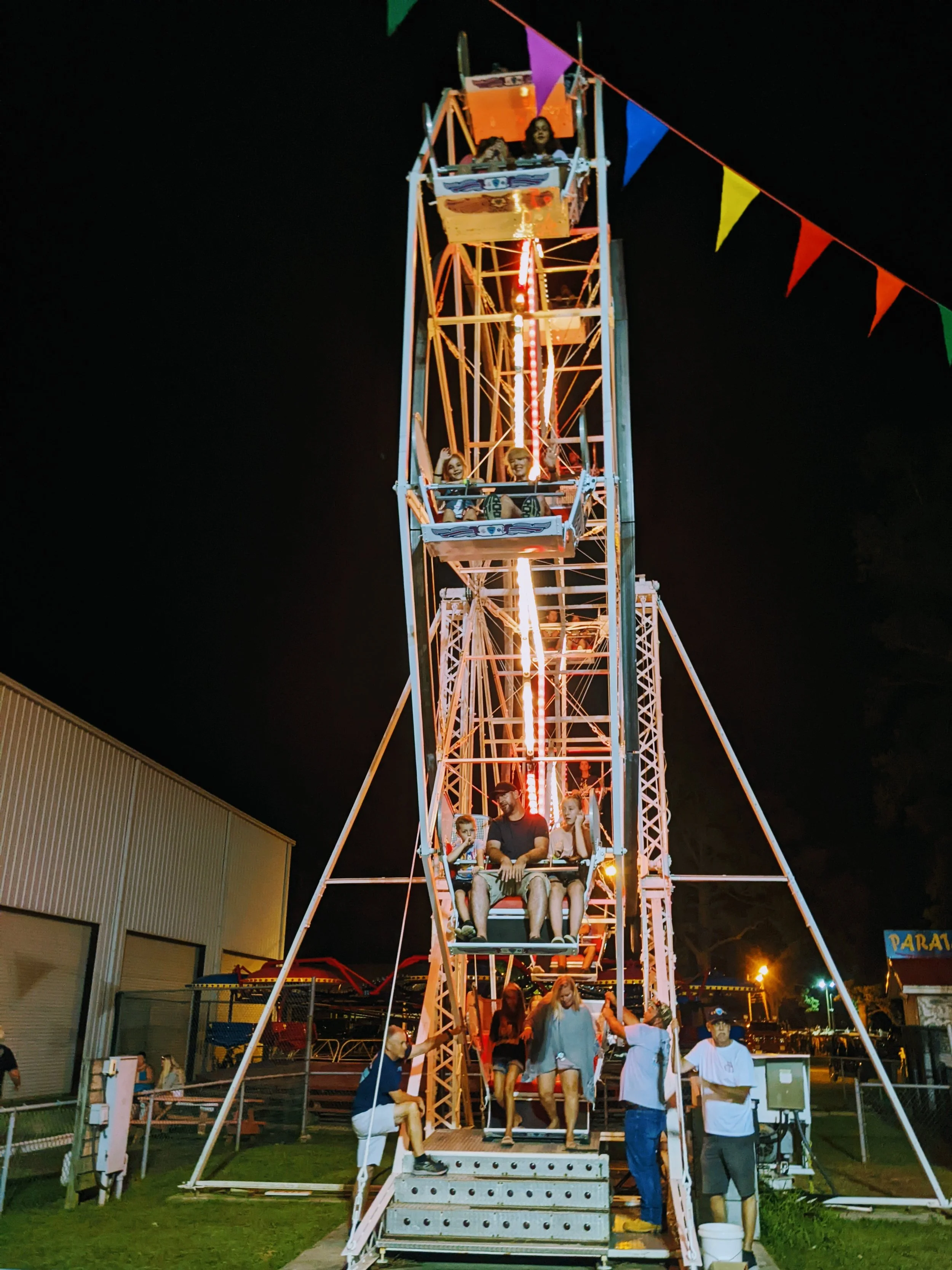 The Chincoteague Volunteer Fireman’s Carnival draws thousands of visitors during pony week. That’s my granddaughter and me in the third car from the bottom.