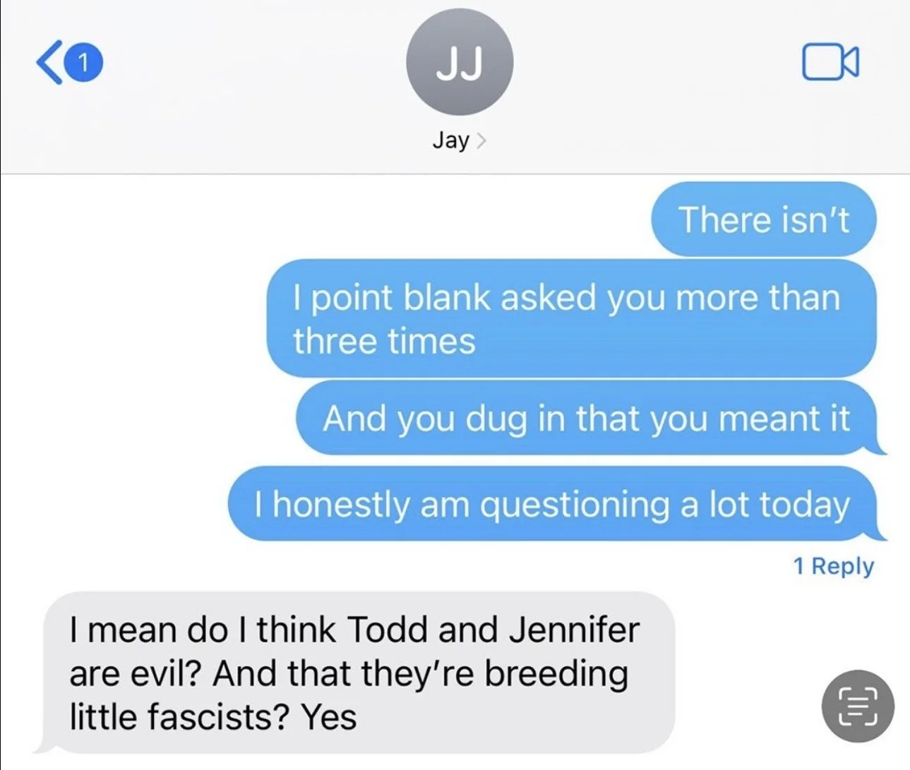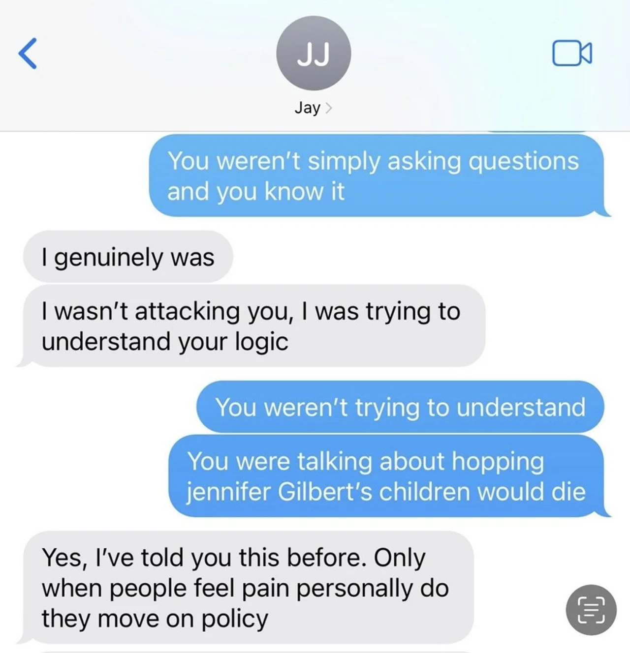 That guy in the political argument whose language gets a little overheated? He doesn’t particularly bother me. Jay Jones? He bothers me. Jones is a professional politician, and he was talking to one of his colleagues, about one of his colleagues. To suggest that it would be a good thing if that colleagues’ children were murdered in front of her is psychotic in and of itself. But to explain it? To say “Yes?” To say “I’ve told you this before”? To say “Only when people feel pain personally do they move on policy.” That’s an approach. It’s a philosophy. It’s a theory of political action.