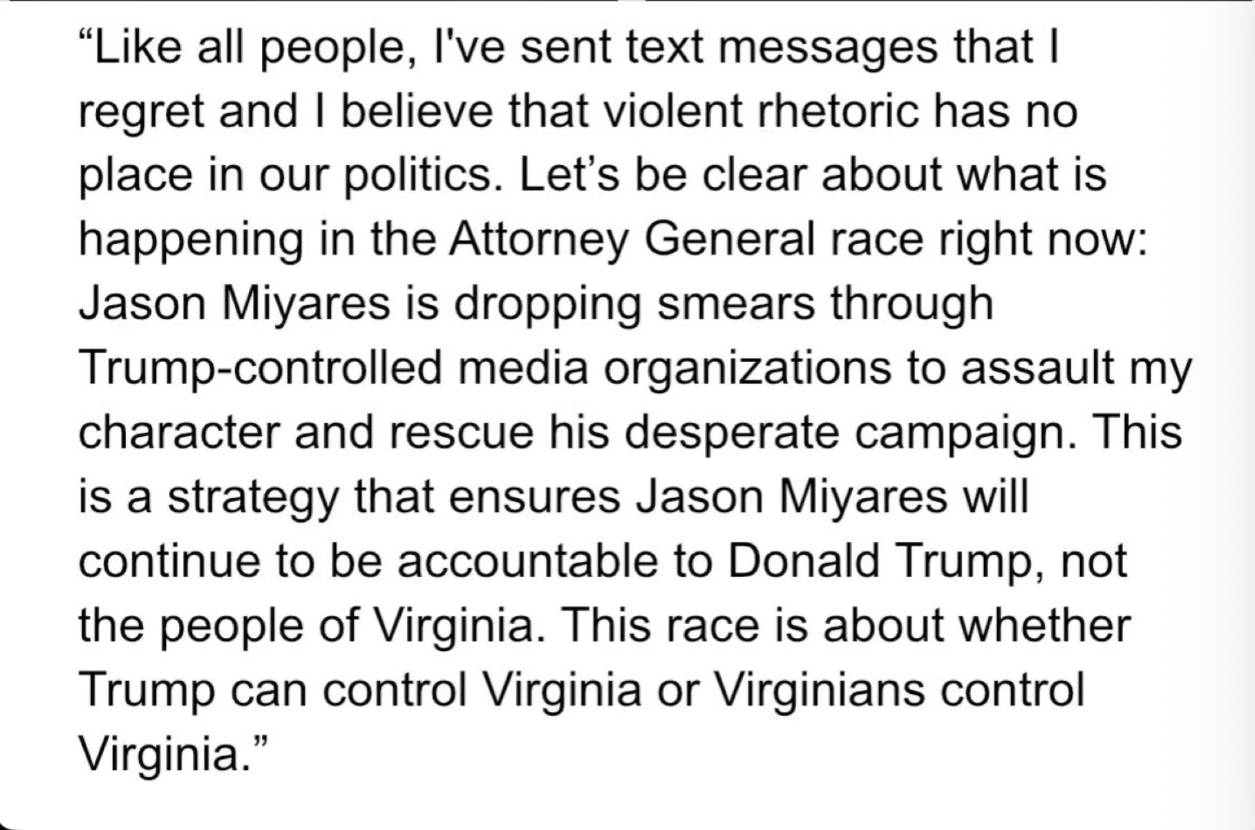 Now, faced with violent, unhinged messages that Jay Jones ADMITS sending, these same politicians are either silent - Tim Kaine, where are you? - or feigning outrage while stopping short of dumping Jones from the ticket.