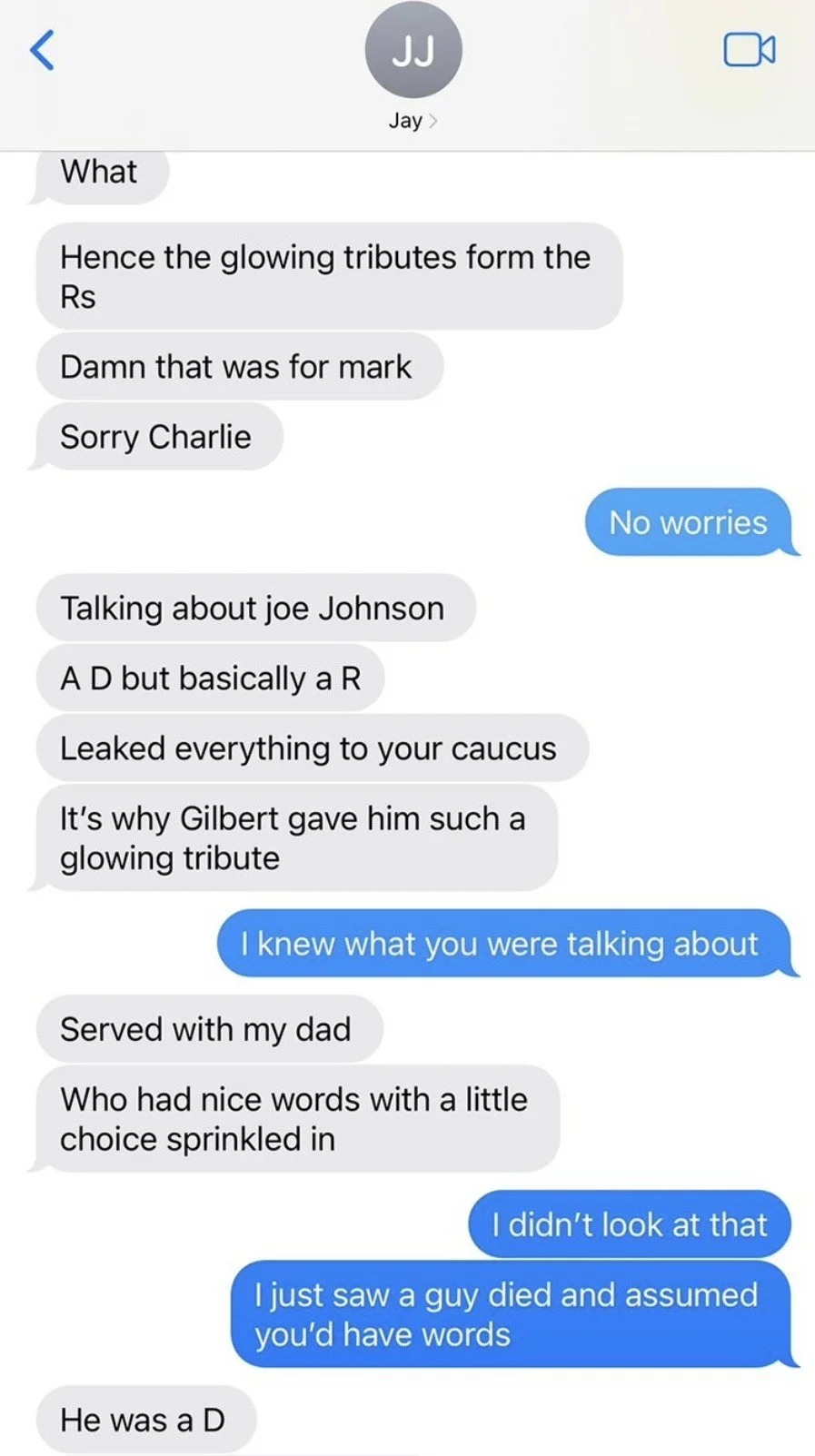 To put this into perspective, this disturbing text chain happened because Jones became apoplectic in 2022 after Republicans honored the memory of Joe Johnson Jr., 90, a moderate Democrat from southwest Virginia. Jones was irate that House Speaker Gilbert eulogized Johnson, who’d spent a total of 27 years in the House and whose wife of 64 years had died just three weeks earlier.