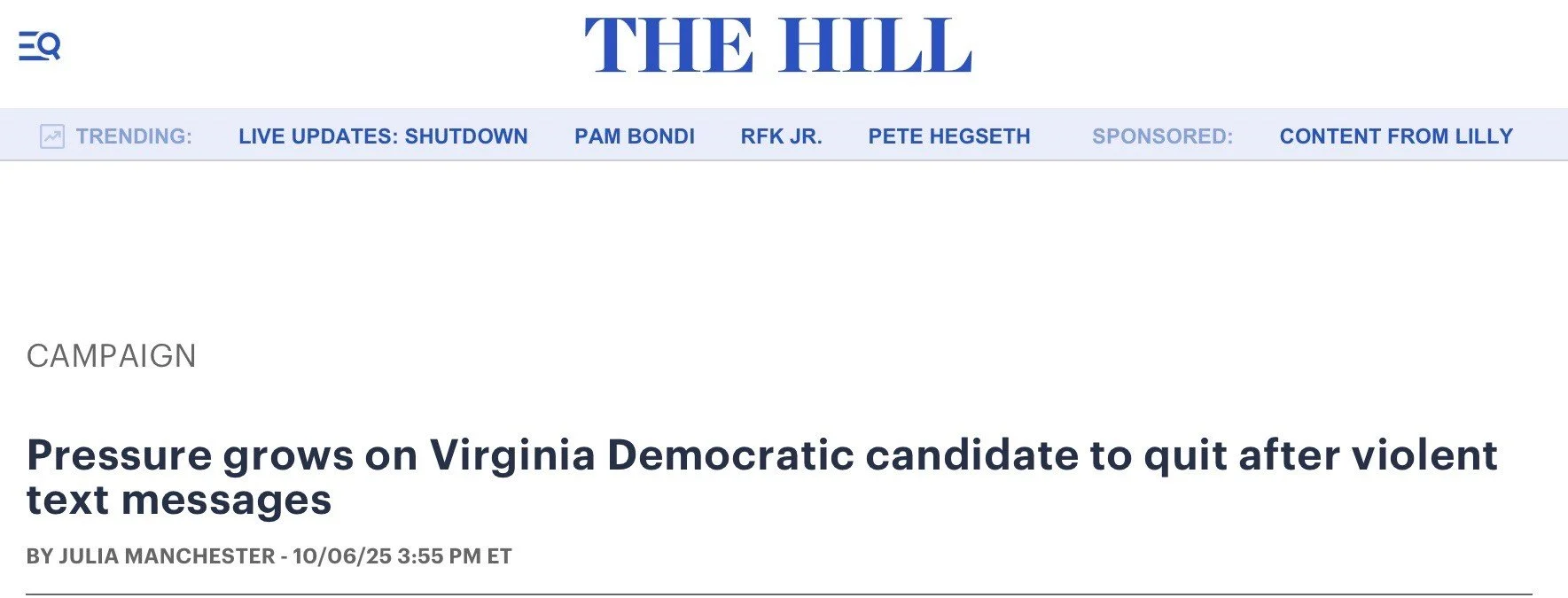 It began with the blockbuster story broken by the National Review Friday afternoon reporting that Virginia’s Democrat nominee for attorney general sent text messages to a colleague saying he wanted to put two bullets in the head of GOP leader Todd Gilbert. Worse, Jones wanted Gilbert’s children to meet a similar fate and die in their mother’s arms because the Gilberts were “breeding little fascists.”