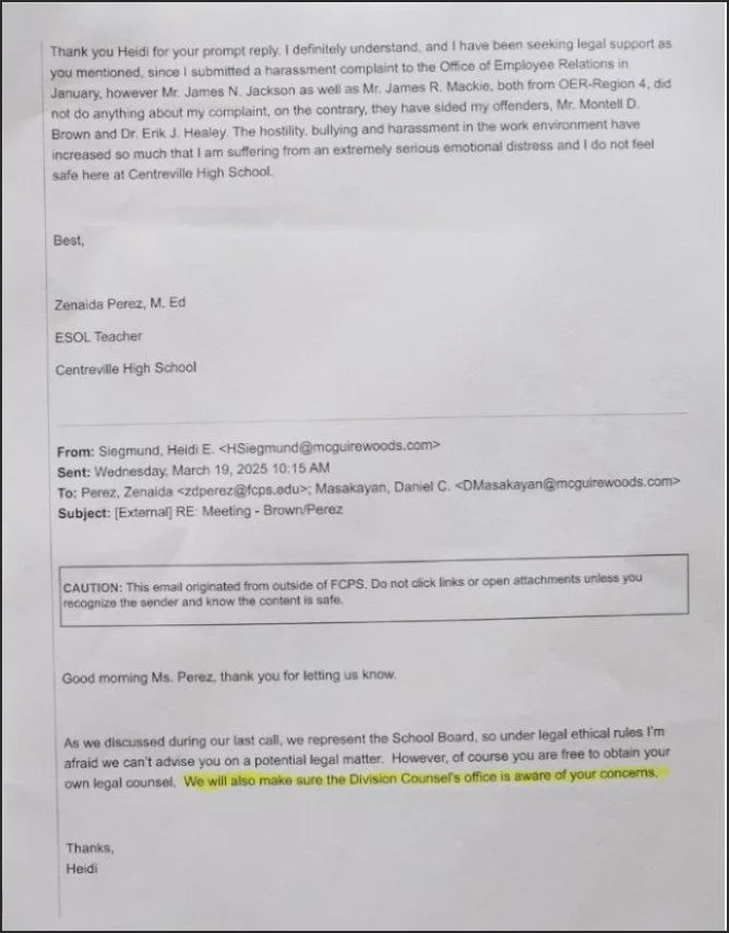 March 7, 2025 – Perez told an attorney for Fairfax County Public Schools — McGuireWoods attorney Heidi Siegmund — about the abortion allegations. Full text below.