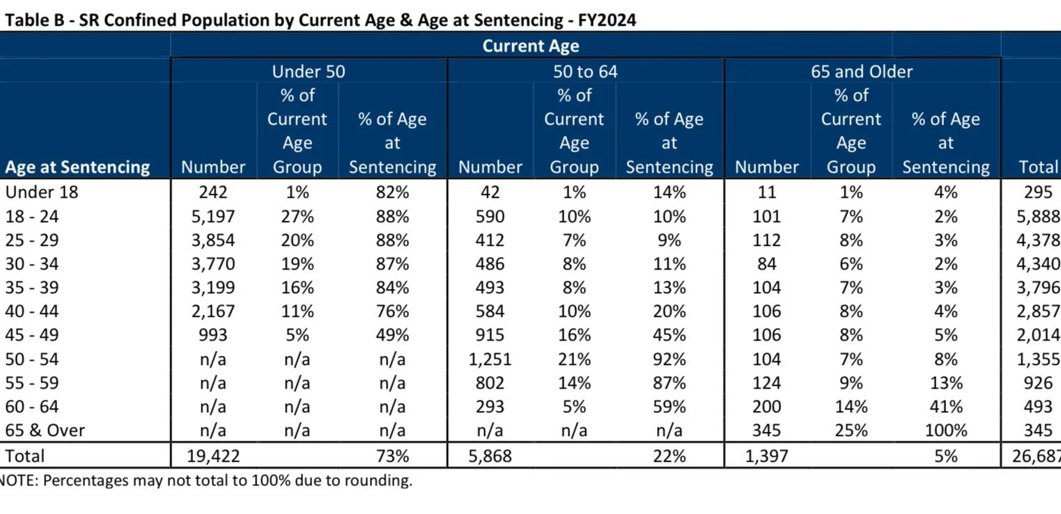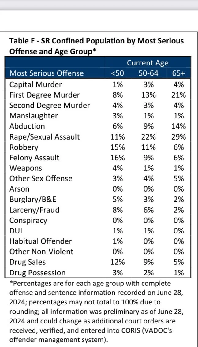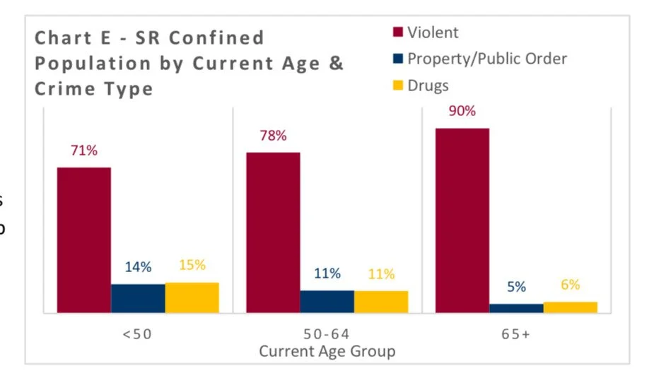 DOC website shows that 90% of those 65 and older are in prison for violent felonies. A full 29 percent of those are in for rape of sexual attacks.