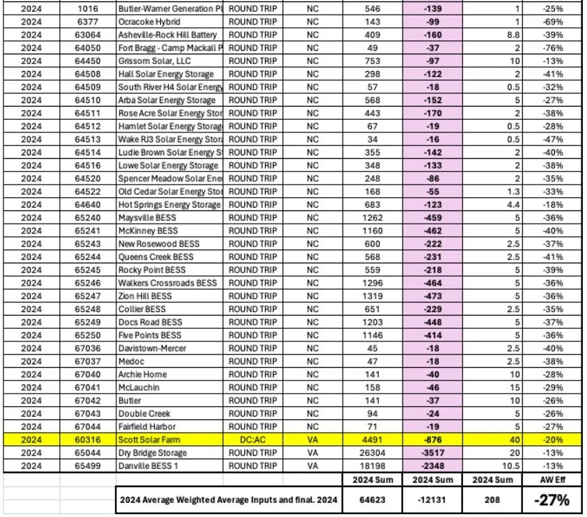 A local energy engineer then contacted Bacon’s Rebellion to argue that the efficiency figure is worse than that. He came armed with actual performance data on North Carolina and Virginia utility scale batteries from 2020 to 2024, culled directly from U.S. Energy Information Agency public data.