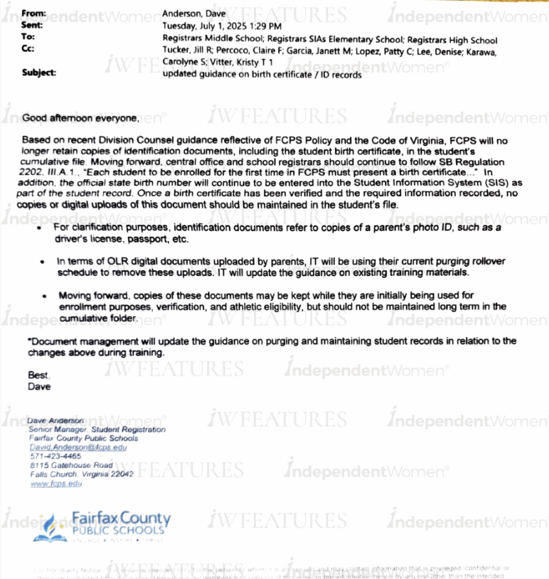 Likely with the intent to evade ICE, district leaders have also admittedly instructed school officials to purge every student’s identity records. On July 1, 2025, Dave Anderson, a senior district manager for student registration, sent an email to school-based registrars—labeled as confidential—that states: “Based on recent Division Counsel guidance reflective of FCPS Policy and the Code of Virginia, FCPS will no longer retain copies of identification documents, including the student birth certificate, in the student’s cumulative file… For clarification purposes, identification documents refer to copies of a parent’s photo ID, such as a driver’s license, passport, etc.”