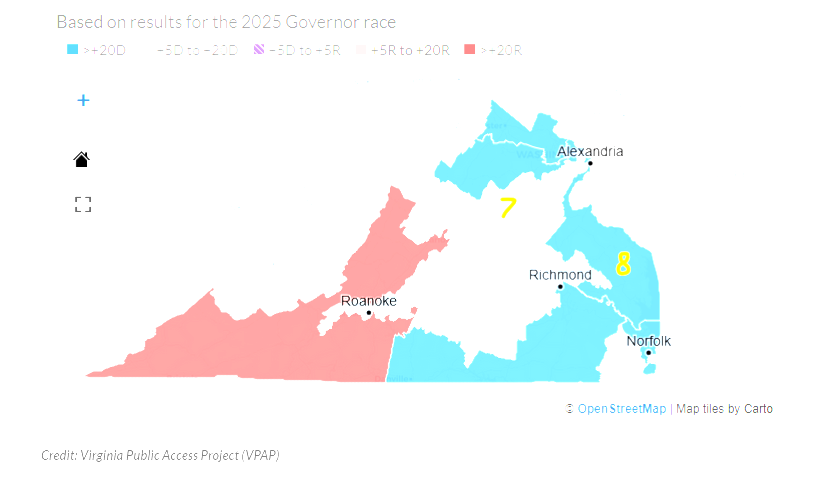 The ballot referendum to redistrict Virginia would hand four of five Republican congressional districts to Democrats. That effort only won by three points, 51–48 (unofficial results) despite over $100 million of untraceable dark-money rolling in for the Democrats "Vote Yes" campaign. They won by only 100,000 votes state-wide.